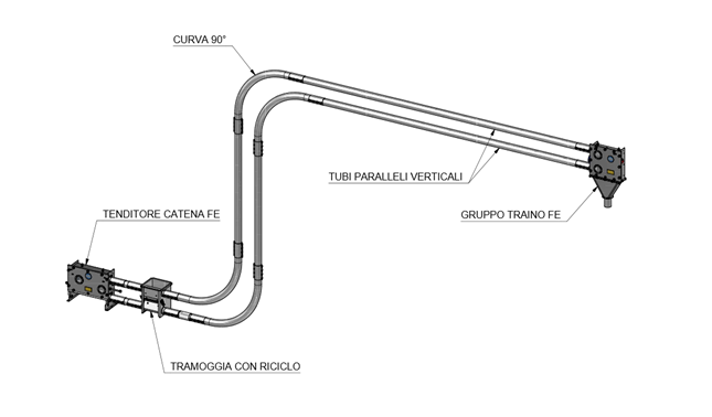 Chain conveyors with a vertically mounted drive unit and parallel tubes with a compact design.