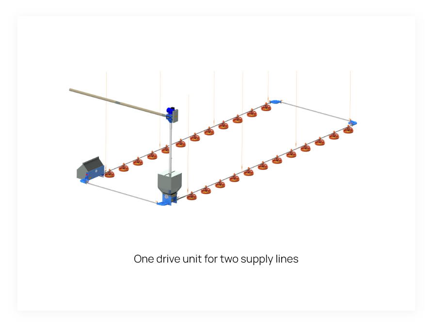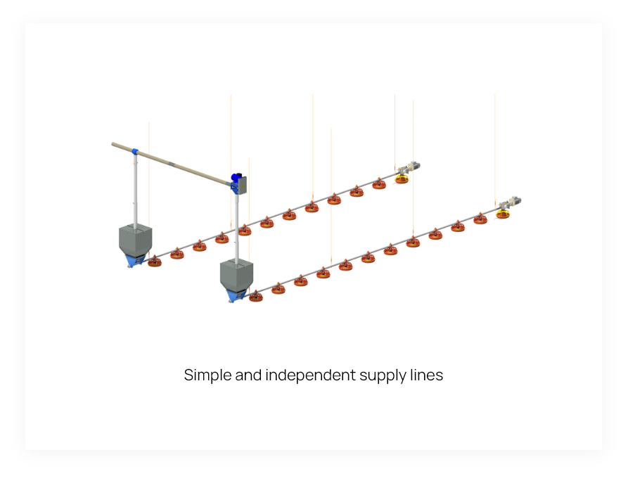 Automated low level feeding systems for broilers, ensuring proper feed distribution in all the pans while promoting animal well-being and reducing management costs.