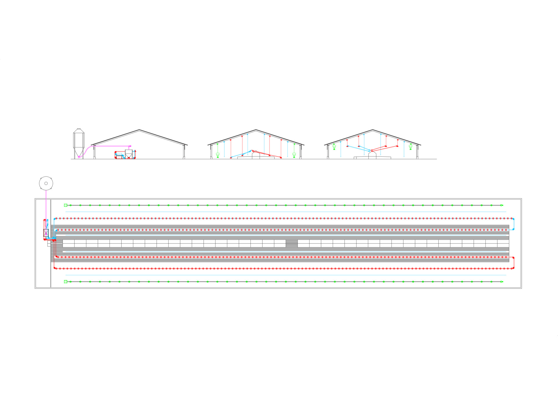 • Feed, taken from one or more silos, is distributed to the barns via an overhead circuit and can be discharged: